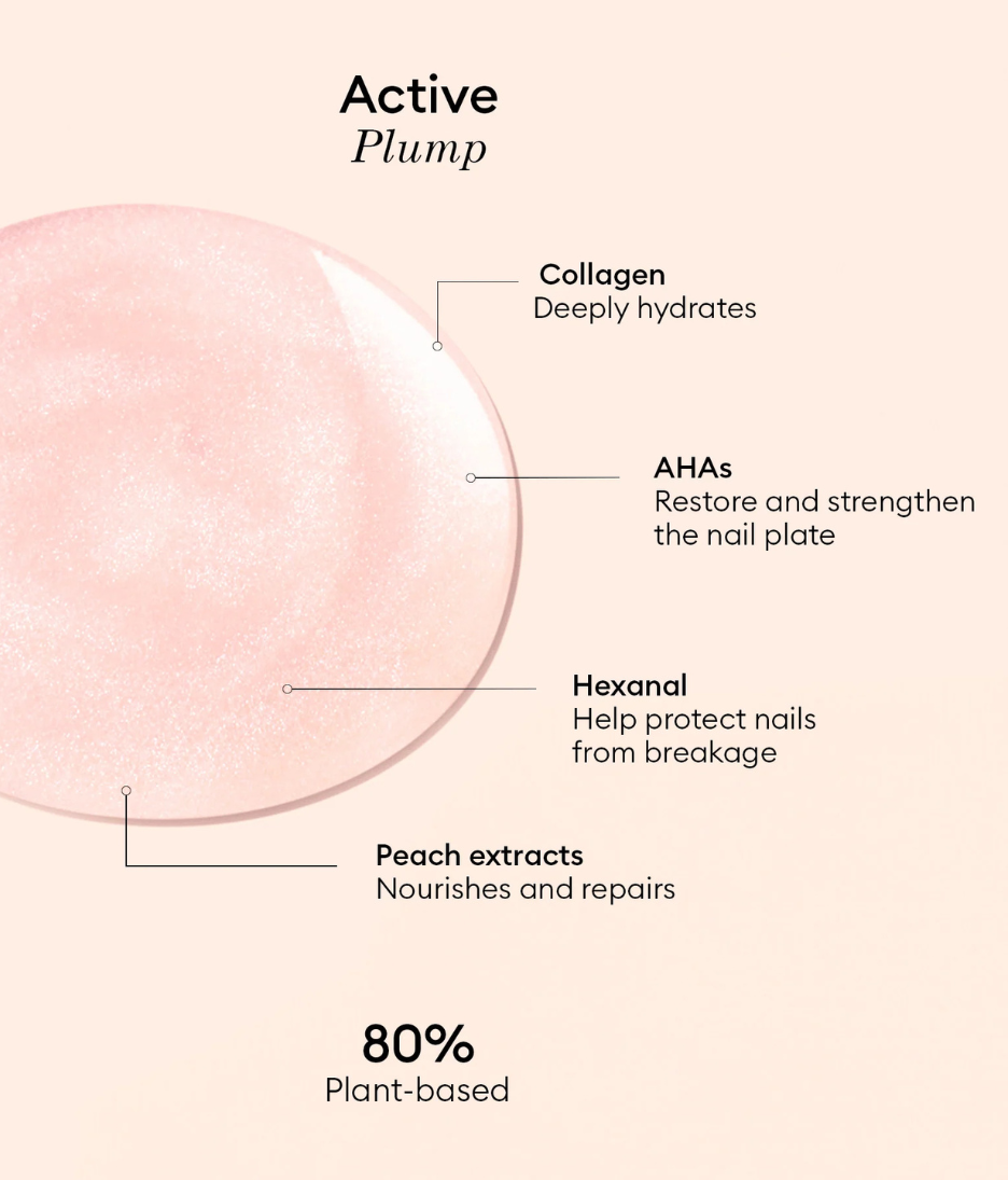 • Active Plump is designed for nails that need a little more “substance” — its nail-care polish delivers targeted hydration and nourishment, helping nails appear thicker, smoother and more robust. The pearly baby-pink semi-opaque finish gives a polished look that still reads natural, making Plump ideal for anyone after healthier-looking nails without heavy polish. Regular use supports hydration and resilience, especially useful if nails have been weakened by gels or frequent manicures.