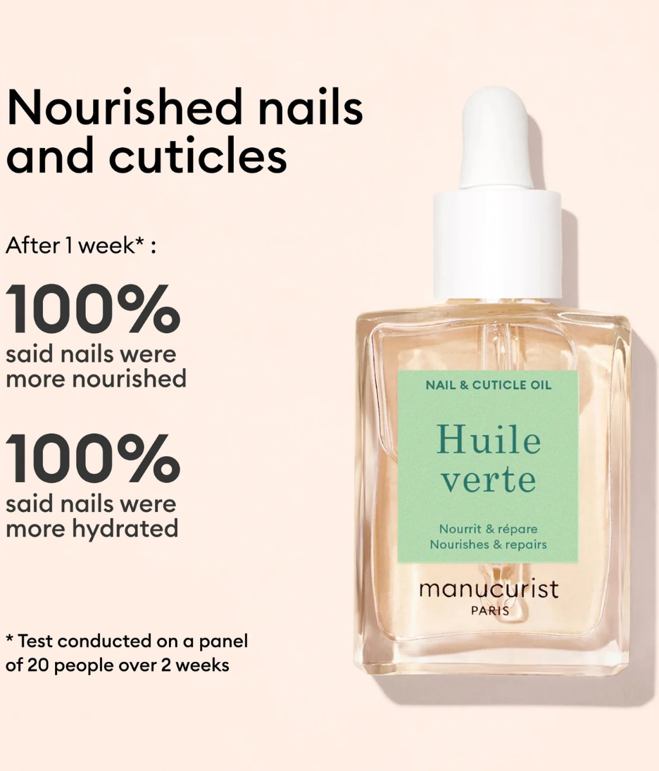 Huile Verte: Apply daily to nails and cuticles, massaging until absorbed. Can be used before bed or throughout the day.
