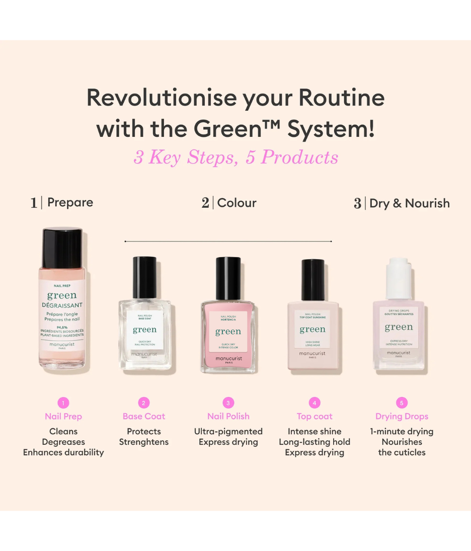 • The Discovery Kit Green™ is the ideal introduction to Manucurist’s clean, plant-based manicure system. It includes everything needed for a full at-home manicure: a nail cleanser to prep the nail plate, a strengthening Green™ base coat, the bestselling shade Hortencia, and the ultra-shiny Sunshine Top Coat, all complemented by Drying Drops for a faster, smudge-proof finish.