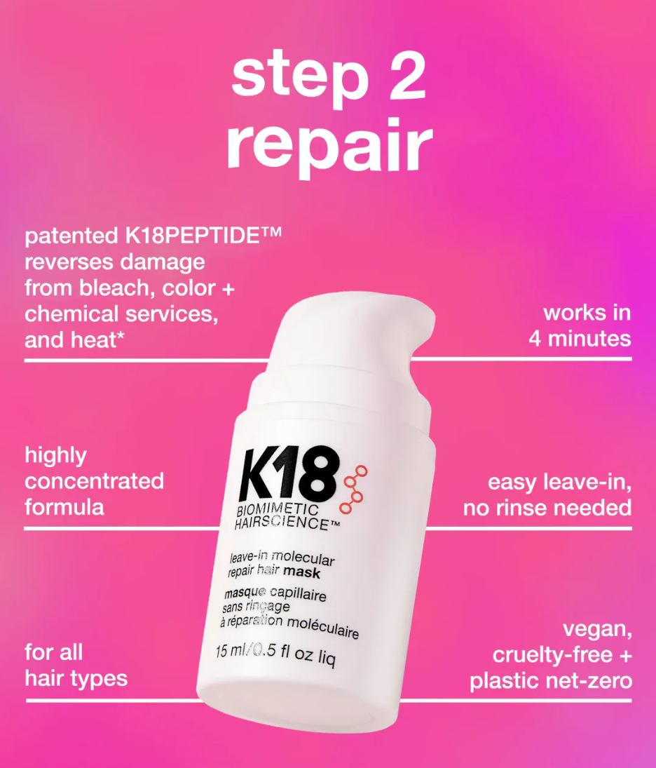 Water (Aqua), Alcohol Denat., Propylene Glycol, Cetearyl Alcohol, Dicaprylyl Ether, Cetyl Esters, Behentrimonium Chloride, Polysorbate 20, sh-Oligopeptide-78 (K18PEPTIDE™), Hydrolyzed Wheat Protein, Hydrolyzed Wheat Starch, Isopropyl Alcohol, Tocopherol, Phenoxyethanol, Potassium Sorbate, Citric Acid, Fragrance (Parfum), Geraniol, Linalool, Hexyl Cinnamal, Benzyl Alcohol
