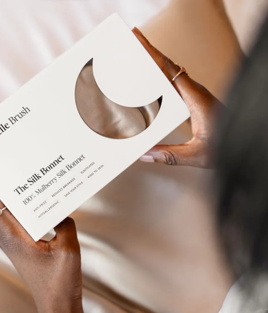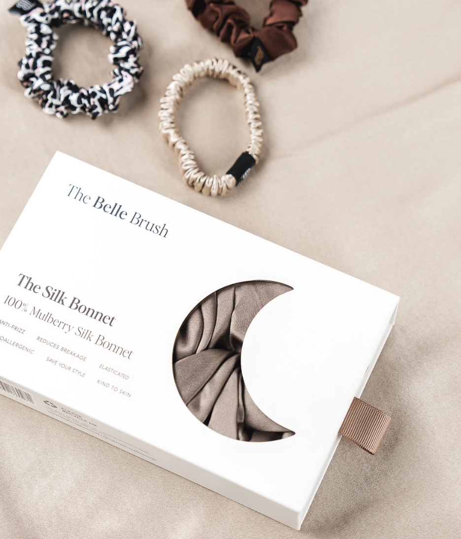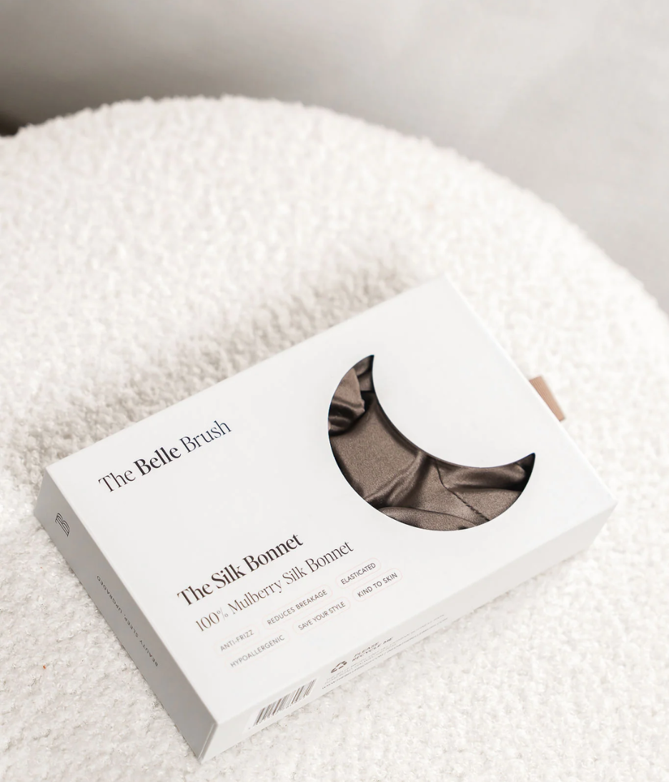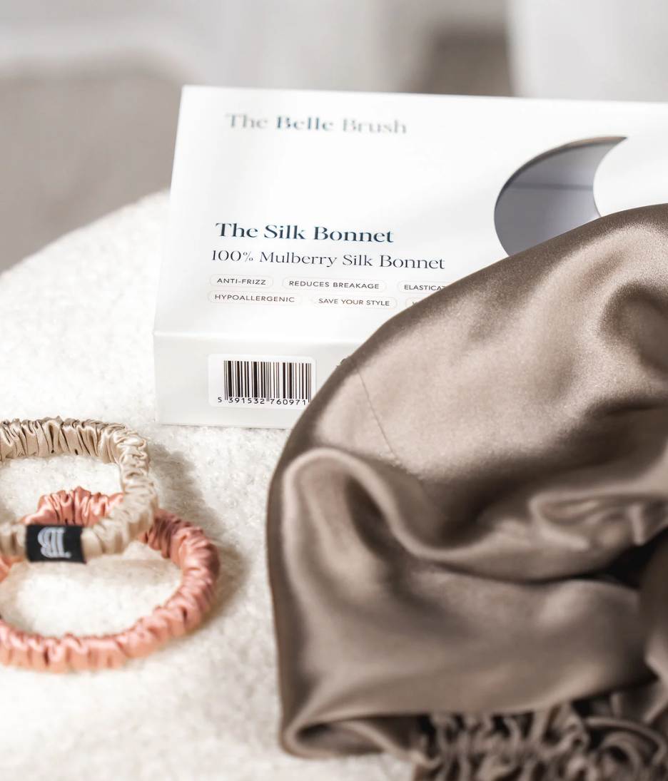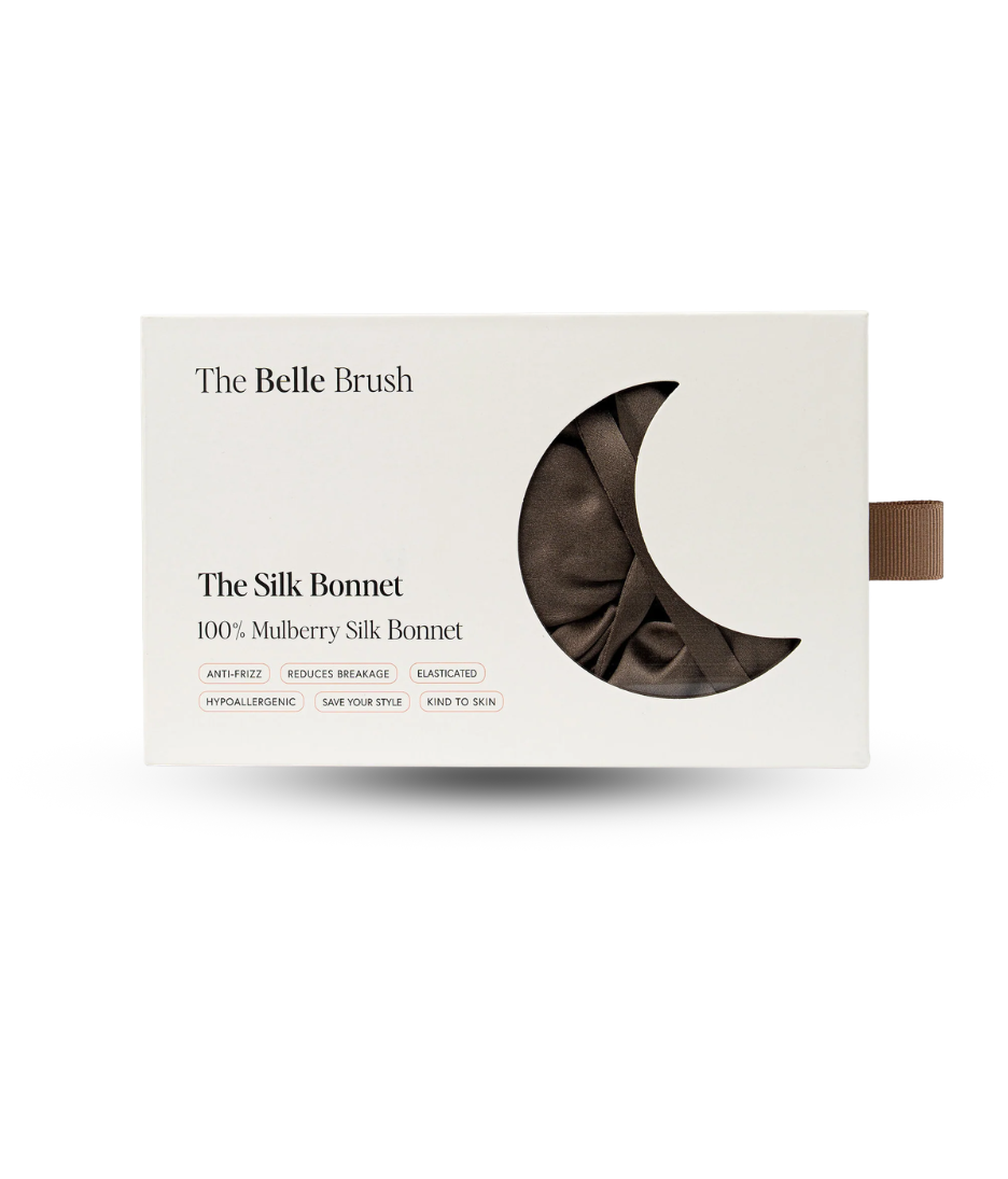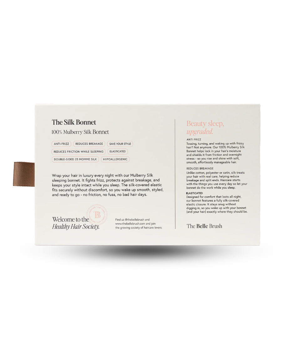 • The Belle Brush Silk Bonnet is crafted from 100% mulberry silk to protect hair while you sleep. Unlike cotton pillowcases, silk reduces friction against the hair shaft, helping to prevent frizz, tangling and breakage overnight.