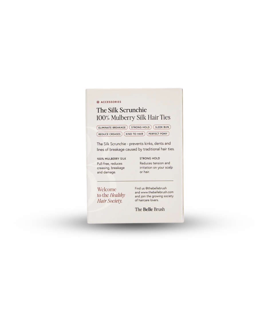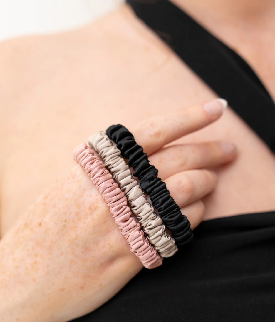 Luxury skinny silk scrunchies designed to reduce hair breakage, prevent kinks and protect shine while keeping hair securely in place.
